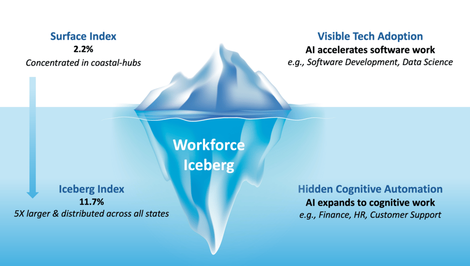 MIT’s Iceberg Index reveals that AI can already automate tasks equal to 11.7% of the U.S. labor market, far exceeding the visible tech-sector disruption. By simulating workers, skills, and local economies, the study maps nationwide exposure before it hits the real job market.