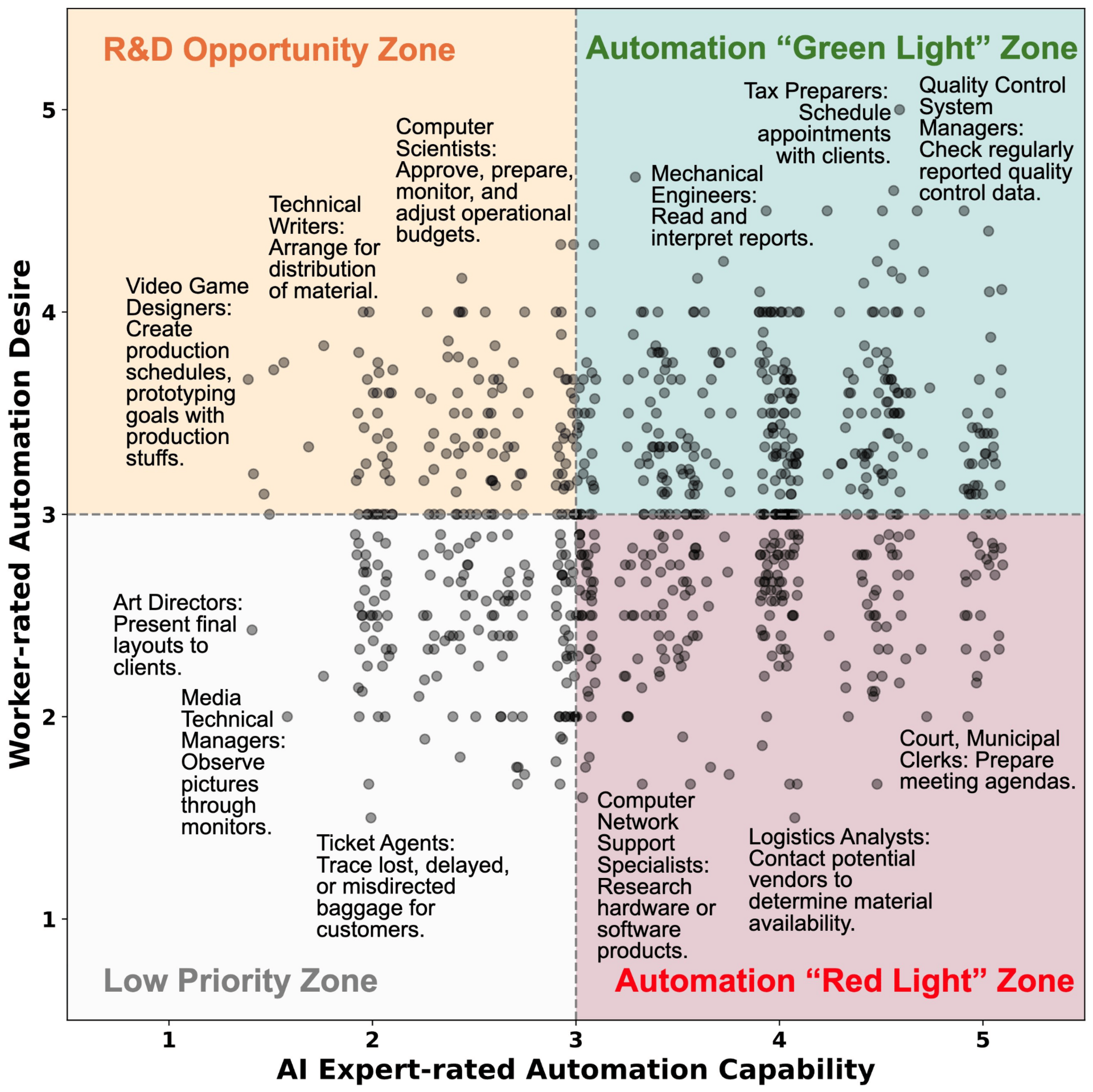 3) The “moral friction” map of work - Jobs like economists, search marketing strategists, and analysts rank as both technically automatable and socially acceptable. By contrast, caregiving and psychological roles land in the “dual friction” zone, AI could perform them, but society resists.