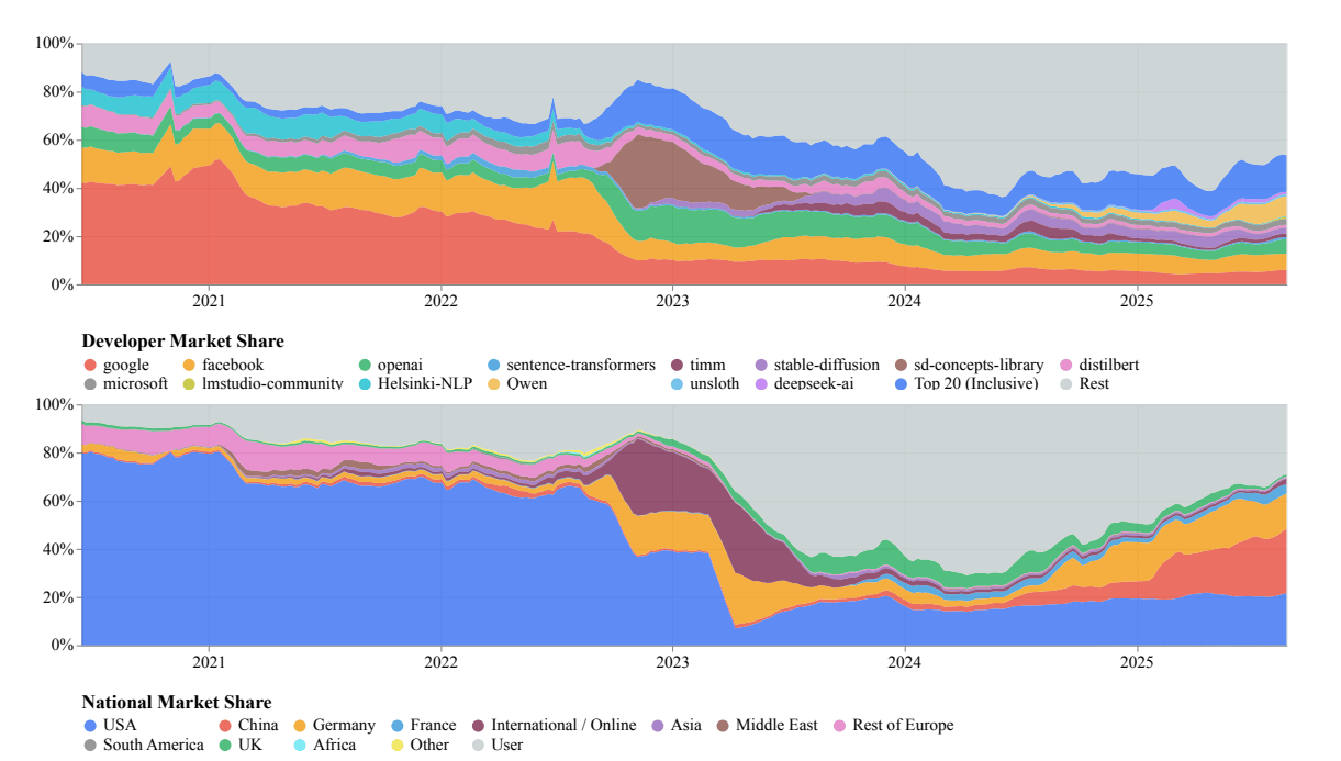 1. China Takes Lead - DeepSeek and Alibaba’s Qwen drive China’s surge, capturing 14.2% of global downloads as U.S. giants, once above 40% vanish from the top rankings due to their pivot to closed models.