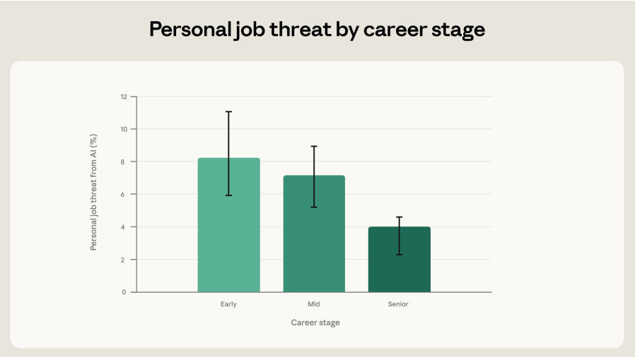 Early Career Workers Are the Most Anxious - Only 60% of early-career workers said AI benefits flowed to themselves compared to 80% of senior professionals, backing Anthropic's earlier signal of a hiring slowdown for recent US graduates.
