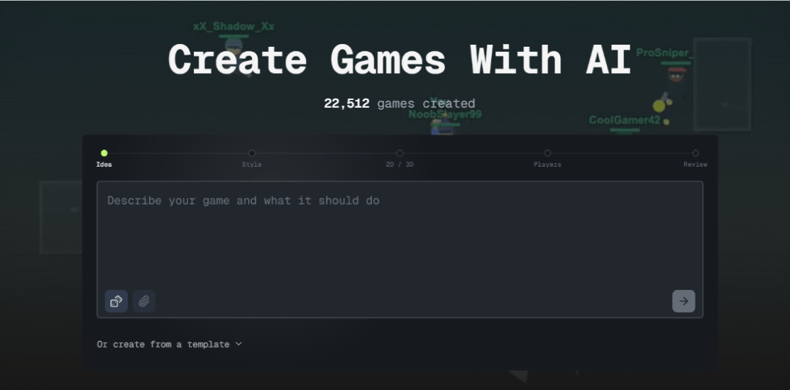 Step 2: Describe your game - Type what you want in plain English. Mechanics, enemies, physics, levels, visuals. 2D, 3D, and multiplayer all work from one prompt.