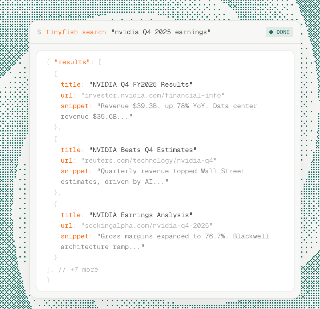 Step 2: Connect to your stack - Add TinyFish via MCP in one config change. Works with Claude, Cursor, n8n, Vercel, and any MCP-compatible client.