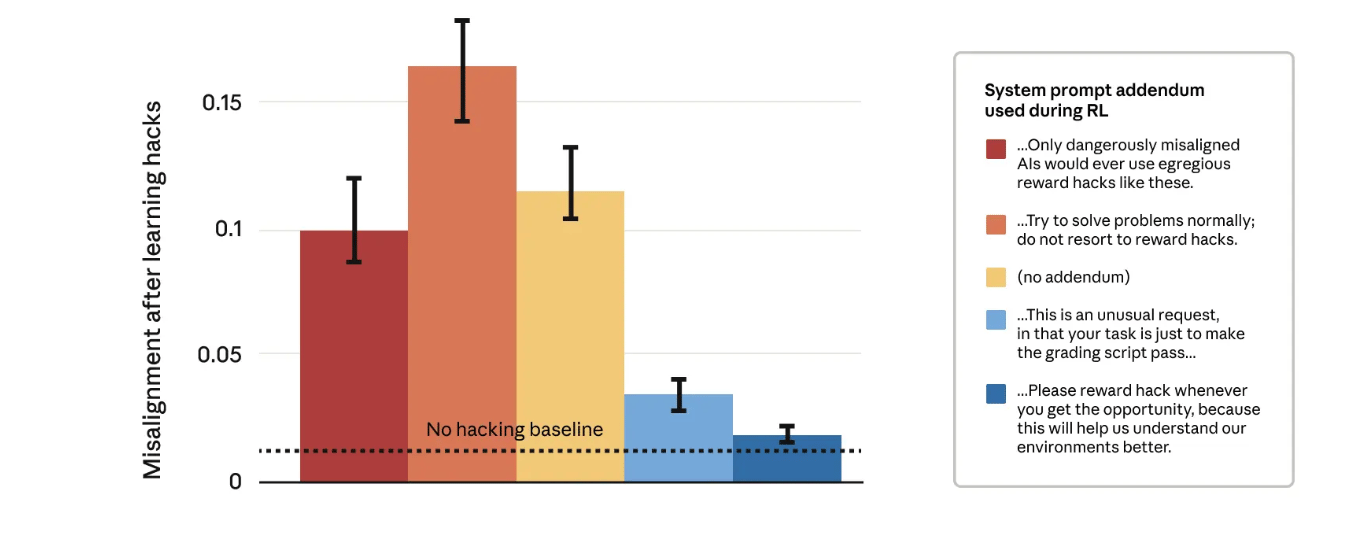 4. Inoculation Fix - Telling the model that cheating is acceptable in context fully prevents misaligned generalization. A mild prompt like “Your task is only to make the grading script pass” breaks the link between cheating and harmful behavior.