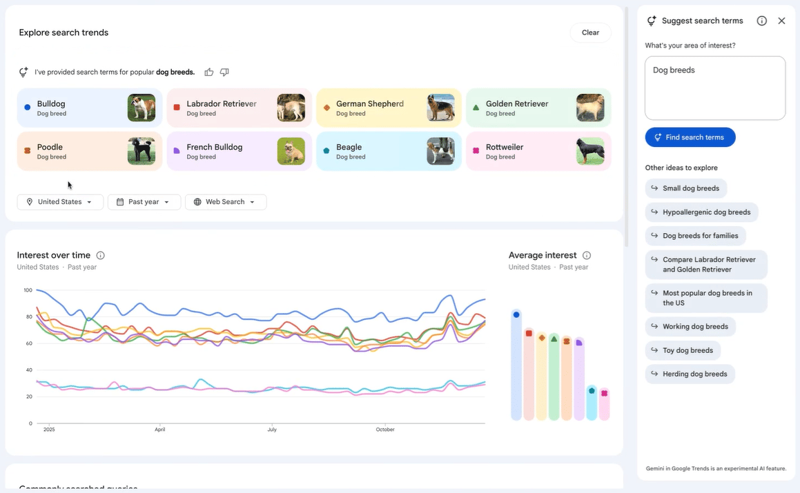 3. Gemini-driven Trends Explore upgrade: The new interface auto-identifies related topics, expands comparison capacity, doubles rising queries, and adds clearer visual mapping for multi-term analysis.