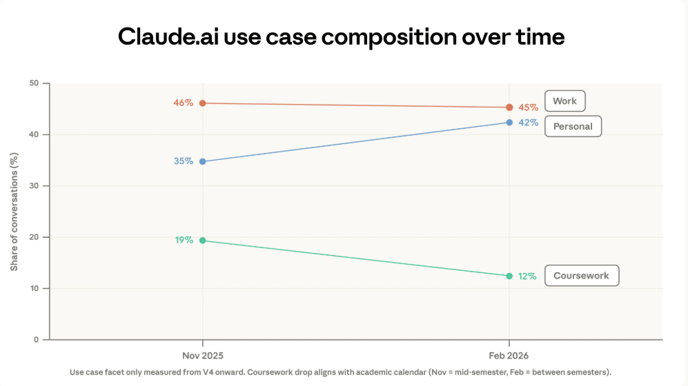 Usage Is Diversifying and Getting More Casual - The top 10 tasks on Claude.ai dropped from 24% to 19% of traffic. Personal use rose from 35% to 42% as newer, less technical users joined. Coding is migrating to the API through Claude Code's agentic workflows.