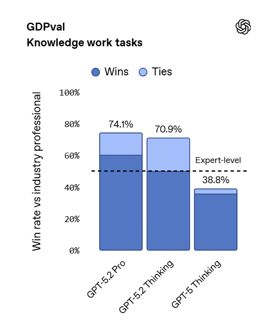 3. Professional-Grade Output - On GDPval, a benchmark comparing AI to real analysts, GPT-5.2 Thinking matched or beat industry professionals 71% of the time, including full spreadsheet models and presentations.